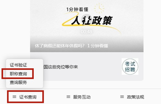 也可通过“人力资源和社会保障部”微信公众号,菜单栏“证书查询”—“职称查询”,进入查询页面。